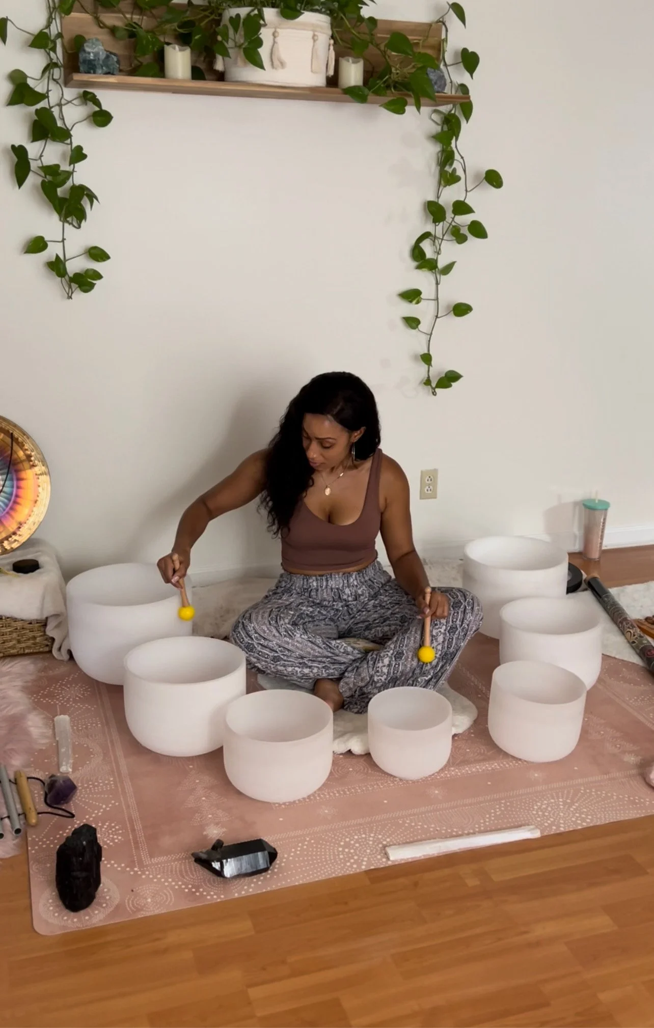 - Crystal singing bowls (various sizes, including full chakra set)